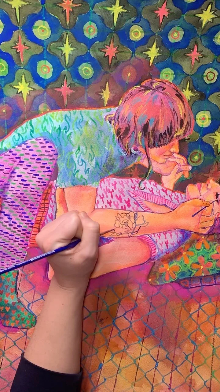 My work centers around queer identity and radical authenticity. I use color and light to explore spaces between binaries. My paintings seek to examine questions such as where does the boundary lie between enjoyment and indulgence? When can self-medication become self-harm? Does reality exist? How can one find stability in a world of constant change and impermanence? At what point does self-expression become a charade? I use co-existing opposites, contrasting colors and values, and a combination of organic shapes and patterns to explore these questions. My goal is to relay universal themes— isolation, self-medication, constructed identities, etc — through specific snapshots of a particular subculture. I live and work in Salt Lake City, Utah, and my community is a vital part of my work. The queer artist subculture is so unique here. Because the state is religiously oppressive, queer and trans people tend to collect in the city, creating a queer bubble where we can live authentically and safely. I paint people in my community who live between binaries as a way to explore my own identity and to show the world how beautiful queer radical authenticity is.